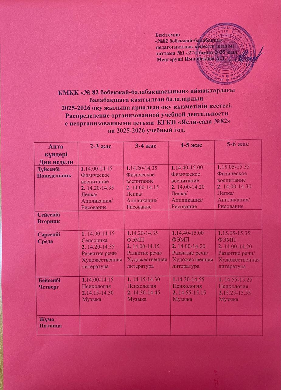 КМҚК "№82 бөбекжай-балабақшасының" аймақтардағы балабақшаға қамтылған балалардың 2025-2026 оқу жылына арналған оқу қызметінің кестесі. » ГККП "Ясли сад №82"